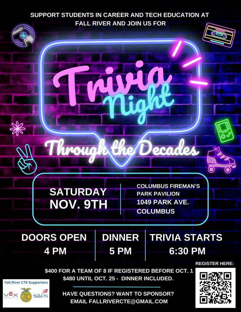 The primary fundraiser hosted annually by the Fall River CTE Supporters is an annual Trivia Night, hosted the second weekend in November each year. This event serves as a way to promote our organization while also celebrating the successes of these student groups. Our Annual Trivia Night brings together community leaders, educators, families and friends to enjoy an evening of camaraderie and fun trivia-competition.